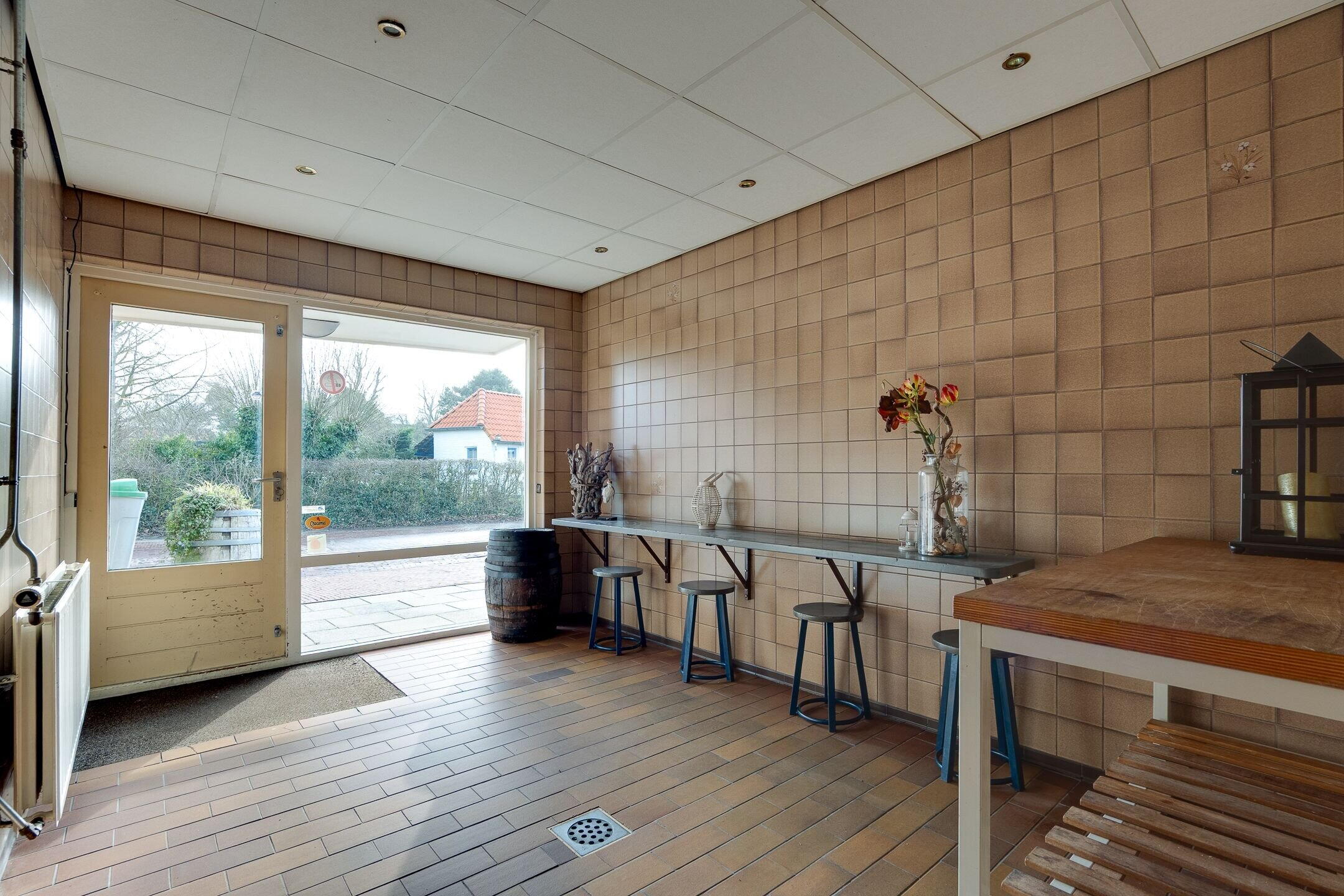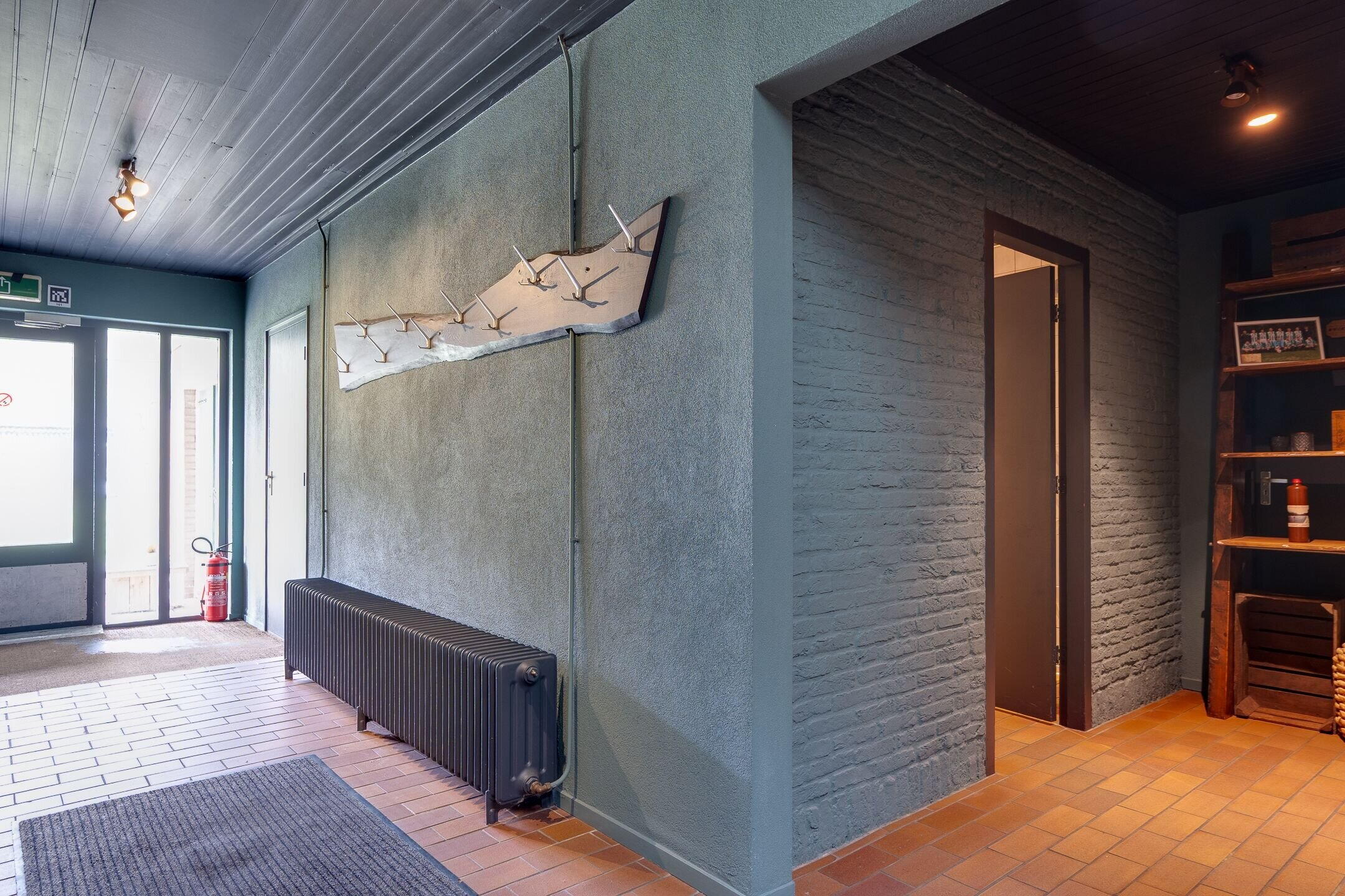 Tochtportaal met entreedeur naar restaurant/zaal van ca. 225m2 met een sfeervol serregedeelte, twee sfeervolle bars, een toegangsdeur naar de wijnkelder en vanuit de restaurantbar een deur naar de achterhal met meerdere toegangsdeuren naar o.a. de voormalige slijterij met een toegangsdeur naar de Schoolstraat, een bergkast en de voormalige cafetaria met eigen entree naar de Schoolstraat met een open doorgang naar de professionele keuken. Vanuit de keuken kan men met een schopschakelaar en sensor naar de centrale gang die leidt naar 2 separate ruimten met heren- en damestoiletten. Er zijn 2 damestoiletten en een ruimte met 2 vaste wastafels en een ruimte met een herentoilet, 4 urinoirs en een wastafel. Vanuit deze hal is eveneens de achteruitgang bereikbaar en de toegang naar meerdere magazijnen en bergingen. Aangrenzend aan het achterste bargedeelte zijn verregaande voorbereidingen getroffen voor een extra zij-uitgang, een garderobe en een gehandicaptentoilet zodat deze ruimte ook geheel zelfstandig verhuurd kan worden Ook hier is vloer voorzien van schuimbeton met daarop een pvc-vloer.
